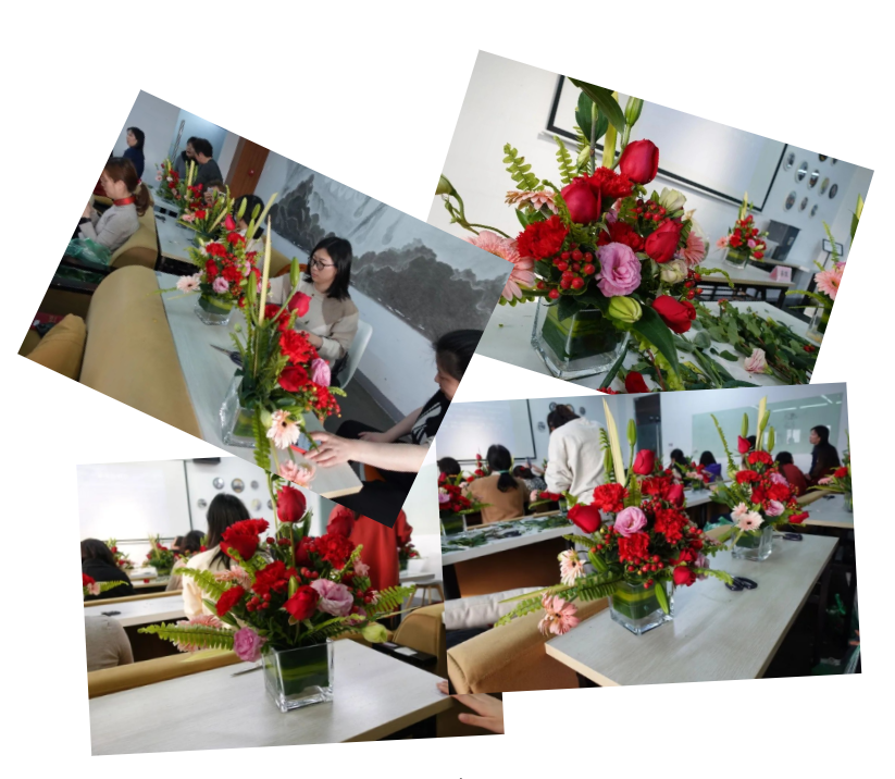 讲座中,老师讲解了花艺的基本知识、各种花材花语以及选花修枝、插花搭配技巧等内容,现场示范指导大家做出一个个精美别致的插花作品。