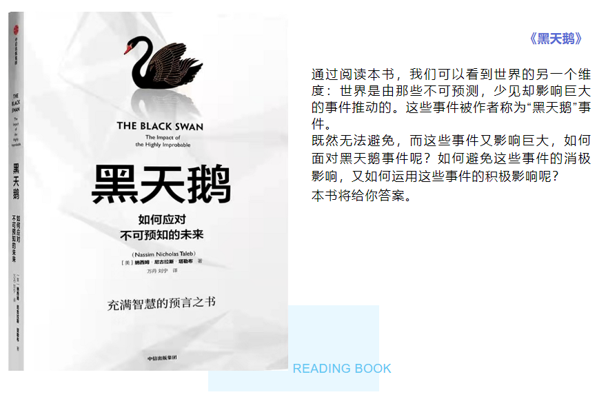 透过这本书,我们分析到:叙述谬误、证实谬误和幸存者偏差等因素误导我们的认知,高估自己的知识,低估世界的不确定性;错误的地图让我们低估了黑天鹅出现的概率,只能处理平均斯坦的不确定性,而不能适应极端斯坦的黑天鹅。那么如何应对黑天鹅?本书建议我们需要承认无法预测黑天鹅事件并增强自身的抗打击能力。
